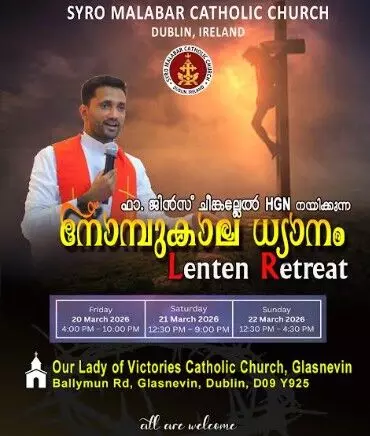 ഡബ്ലിന് റീജിയണിലെ ഈ വര്ഷത്തെ നോമ്പുകാല ധ്യാനം ഗ്ലാസ്നോവിന് ഔര് ലേഡി ഓഫ് വിക്ടറീസ് ദേവാലയത്തില് 2026 മാര്ച്ച് 20,21,22 (വെള്ളി, ശനി, ഞായര്) തീയതികളില് നടത്തപ്പെടുന്നു. മാര്ച്ച് 20 വെള്ളിയാഴ്ച വൈകിട്ട് 4 മണി മുതല് 9 മണി വരേയും, ശനിയാഴ്ച ഉച്ചക്ക് 12:30 മുതല് വൈകിട്ട് 9 വരേയും, ഞായറാഴ്ച ഉച്ചയ്കക്ക് 12:30 മുതല് വൈകിട്ട് 4:30 വരെയുമാണു ധ്യാനം നടത്തപ്പെടുക