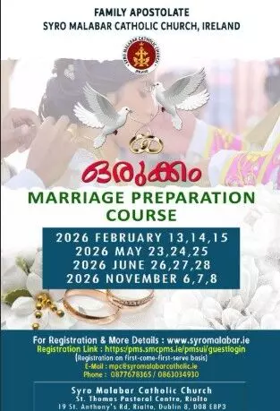 ഡബ്ലിന്: അയര്ലണ്ട് സീറോ മലബാര് സഭയുടെ ഫാമിലി അപ്പസ്തോലേറ്റ് സംഘടിപ്പിക്കുന്ന വിവാഹ ഒരുക്ക സെമിനാര് - ഒരുക്കം 2026 ഫെബ്രുവരി, മെയ്, ജൂണ്, നവംബര് മാസങ്ങളില് നടത്തപ്പെടും. ഈ വര്ഷം നടക്കാനിരിക്കുന്ന കോഴ്സുകളിലേക്കുള്ള രജിസ്ട്രേഷന് നിലവില് പുരോഗമിച്ചുകൊണ്ടിരിക്കുകയാണ്.