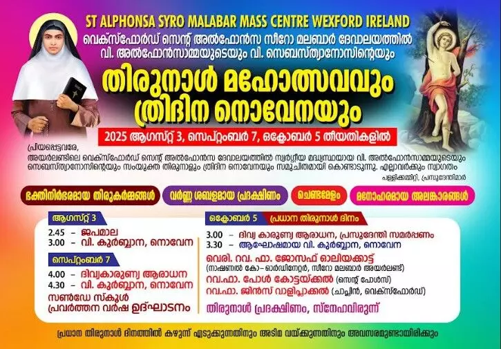 വെക്സ്ഫോര്ഡ് (അയര്ലണ്ട്). വെക്സ്ഫോര്ഡ് സെന്റ് അല്ഫോന്സാ സീറോ മലബാര് കമ്യൂണിറ്റിയില് ഇടവക മധ്യസ്ഥയായ വി. അല്ഫോന്സാമ്മയുടേയും, പരിശുദ്ധ ദൈവമാതാവിന്റേയും വി. സെബസ്ത്യാനോസിന്റേയും സംയുക്ത തിരുനാള് 2025 ഒക്ടോബര് 5 ഞായറാഴ്ച് വിപുലമായ രീതിയില് ആഘോഷിക്കുന്നു.
