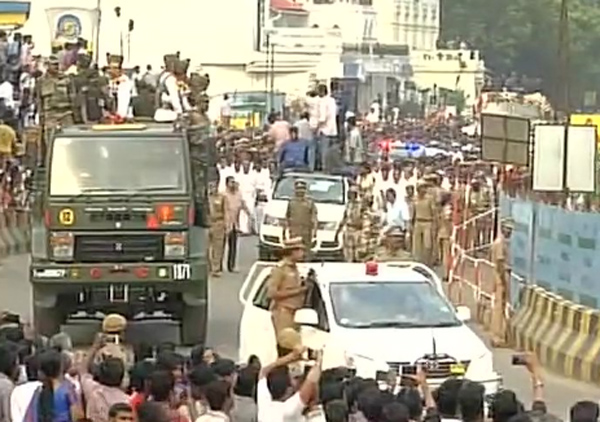 #WATCH: Funeral procession of #Jayalalithaa underway, to be buried at MGR memorial, Marina Beach in Chennai. pic.twitter.com/8G87nNsiix
