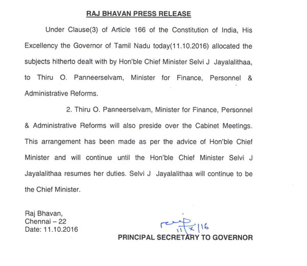 തമിഴ്നാട് മുഖ്യമന്ത്രി ജയലളിതയുടെ ആരോഗ്യസ്ഥിതിയെ സംബന്ധിച്ച ദുരൂഹതകൾ നിലനിൽക്കുന്നതിനിടെയാണ് ഈ മാറ്റം. അതുകൊണ്ട് തന്നെ ജയലളിതയുടെ ആരോഗ്യ സ്ഥിതി ഗുരുതരമാണെന്ന് അണ്ണാ ഡിഎംകെ പ്രവർത്തകർ തിരിച്ചറിയുന്നു. എന്നാൽ പ്രശ്നമൊന്നുമില്ലെന്നാണ് ഇപ്പോഴും പാർട്ടി നേതൃത്വം വിശദീകരിക്കുന്നത്. ഭരണപരമായ സൗകര്യത്തിന് മാത്രമാണ് ഇതെന്നും വ്യക്തമാക്കുന്നു. മുഖ്യമന്ത്രിയുടെ ആരോഗ്യം സംബന്ധിച്ച യഥാർഥ വിവരം പുറത്തുവരുന്നില്ലെന്ന ആശങ്ക സാധാരണ പാർട്ടി പ്രവർത്തകർമുതൽ നേതാക്കൾവരെ വച്ചുപുലർത്തുകതയാണ് തമിഴകത്ത്. ആശുപത്രി അധികൃതർ പുറത്തുവിടുന്ന മെഡിക്കൽ ബുള്ളറ്റിനുകൾമാത്രമാണ് വാർത്താമാദ്ധ്യമങ്ങൾ ഉൾപ്പെടെ ആശ്രയിക്കുന്നത്. അതും വ്യക്തമല്ല.