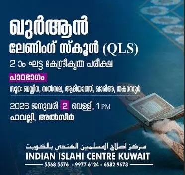 കുവൈത്ത് സിറ്റി : ഇന്ത്യന് ഇസ്ലാഹി സെന്റര് ഖുര്ആന് ലേണിംഗ് സ്കൂ (ഖ്യു.എല്.എസ്) ളിന് കീഴില് ഏകീകൃത സിലബസ് പ്രകാരമുള്ള രണ്ടാം ഘട്ട പരീക്ഷ ജനുവരി 2 ന് വെള്ളിയാഴ്ച ഉച്ചയ്ക്ക് 1 മുതല് ഹവല്ലി അല്സീര് സെന്ററില് നടക്കുമെന്ന് ഐ.ഐ.സി ഖ്യ.എല്.എസ് സെക്രട്ടറി ഷാനിബ് പേരാമ്പ്ര അറിയിച്ചു.