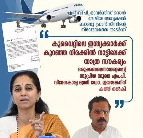 കുവൈറ്റില് നിന്ന് ഇന്ത്യന് പ്രവാസികള്ക്ക് കുറഞ്ഞ ചിലവില് യാത്ര സൗകര്യം ഒരുക്കാന് കേന്ദ്ര സര്ക്കാര് അടിയന്തിരമായി ഇടപെടണം - സുപ്രിയ സുലെ എം.പി