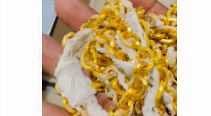 വിമാനത്താവളത്തിന്റെ പുറത്തേക്കുള്ള ഗേറ്റില്‍ വച്ചാണു നൗഷാദിനെ അധികൃതര്‍ പിടികൂടി പരിശോധിച്ചത്. ഷൂസിന്റെ സോളിനുള്ളില്‍ ഒളിപ്പിച്ച 8 മാലകള്‍ പിടികൂടി. പിടിച്ചെടുത്ത സ്വര്‍ണം 465.5 ഗ്രാമുണ്ടെന്ന് അധികൃതര്‍ അറിയിച്ചു.