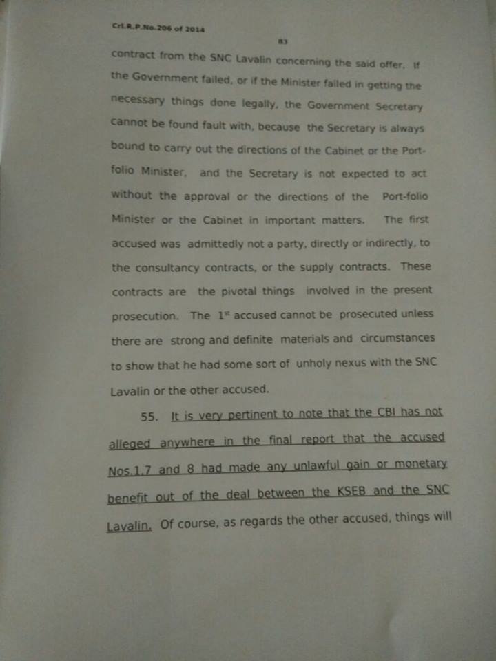 സിബിഐ പറയുന്ന തെളിവുകളൊന്നും കേസിൽ നിലനിൽക്കുന്നതല്ല. ഉദ്യോഗസ്ഥ തലത്തിൽ നടന്ന ഒരു കരാർ മാത്രമാണിത്. കെ.എസ്.ഇബി ബോർഡ് എടുത്ത തീരുമാനം മാത്രമാണിത്. ഈ കരാറിന്റെ വിശദാംശങ്ങളോ ഇതിൽ ആർക്കെങ്കിലും ലാഭമുണ്ടായോ എന്നുള്ളത് 1,7,8 പ്രതികൾക്കൊന്നും അറിയില്ലായിരുന്നു. ക്യാബിനറ്റിൽ ഈ സംഭവവുമായി ബന്ധപ്പെട്ട് യാതൊരു തരത്തിലുമുള്ള മൂടിവെക്കലും നടന്നിട്ടില്ല. സിബിഐയുടെ പക്കൽ ഇവർ ലാഭമുണ്ടാക്കി എന്നതിന് ഒരു തെളിവുമില്ലെന്നും കോടതി പറഞ്ഞു. കമ്പനിയുമായി ബോർഡ് ഉണ്ടാക്കിയ കരാർ മന്ത്രിസഭാ യോഗത്തിൽ വെക്കുകമാത്രമാണ് ഉണ്ടായത്. കമ്പനി ഏതെങ്കിലും തരത്തിൽ കരാർ ലംഘനം നടത്തിയിട്ടുണ്ടെങ്കിൽ അത് പിണറായി അടക്കമുള്ളവരിൽ അടിച്ചേൽപ്പിക്കാനാവില്ലെന്നും കോടതി വ്യക്തമാക്കി. 'പിക്ക് ആൻഡ് ചൂസ്' (തിരഞ്ഞെടുത്ത് പ്രതിയാക്കുക) എന്ന വാക്ക് ഉപയോഗിച്ചാണ് കോടതി സിബിഐയെ രൂക്ഷമായി വിമർശിച്ചത്.