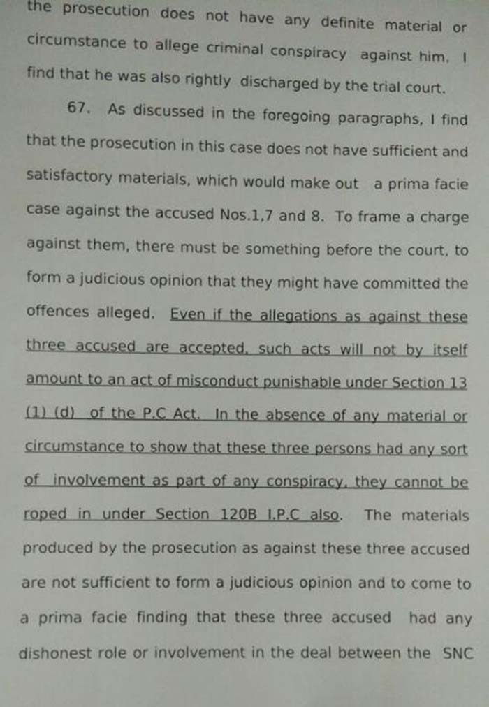 പിണറായി ലാവ്ലിൻ ഇടപാടിൽനിന്ന് സാമ്പത്തിക നേട്ടമുണ്ടാക്കിയിട്ടില്ല. സിബിഐ പിണറായി വിജയനെ കുടുക്കാൻ ശ്രമിച്ചു. പിണറായി വിജയനെതിരെ തെളിവുകളില്ലെന്നും കോടതി നിരീക്ഷിച്ചു. വിധി മുഴുവൻ വായിച്ചതിനുശേഷമേ വാർത്ത നൽകാവൂയെന്ന് മാധ്യമങ്ങൾക്ക് ജഡ്ജിയുടെ നിർദ്ദേശം നൽകിയിരുന്നു. വിധി പറയാൻ മാറ്റിയശേഷം ഊമക്കത്തുകൾ കിട്ടിയെന്നു പറഞ്ഞ ജഡ്ജി, 202 പേജുള്ള വിധിന്യായം മുഴുവൻ വായിച്ചു കേൾപ്പിക്കുമെന്നും വ്യക്തമാക്കി. പെട്ടെന്ന് വിധി പറയാൻ തീരുമാനിച്ചത് ചർച്ചകൾ ഒഴിവാക്കുന്നതിനാണ്. പലർക്കും രാഷ്ട്രീയ ലക്ഷ്യമുണ്ടെന്നും അതു ശരിയല്ലെന്നും കോടതി നിരീക്ഷിച്ചു.