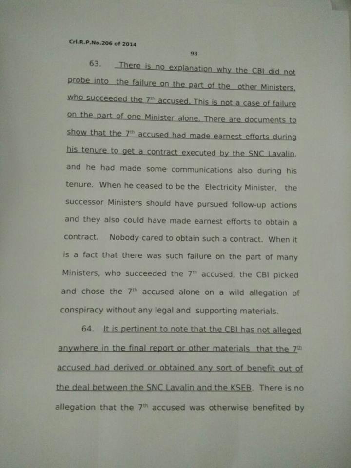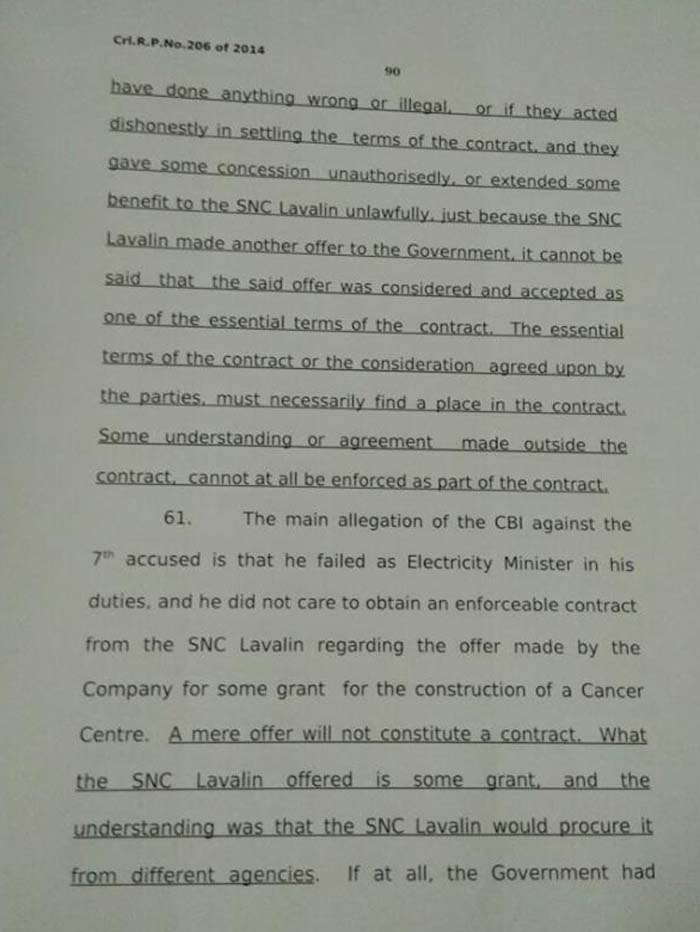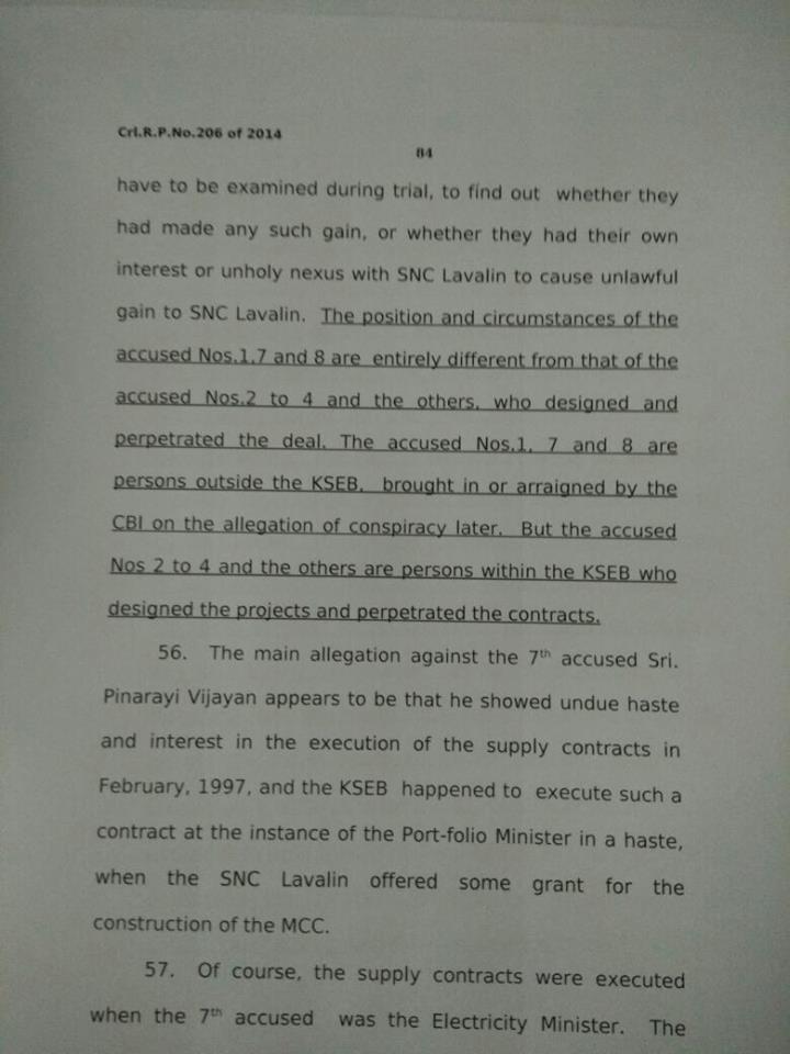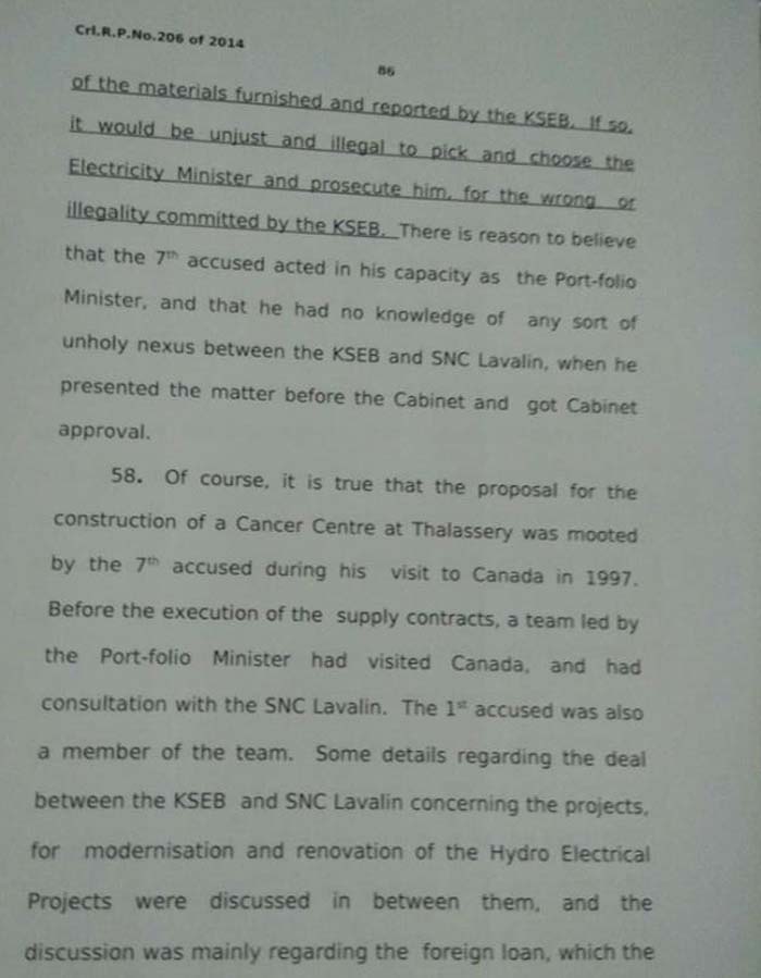 മലബാർ കാൻസർ സെന്റർ എന്ന ആശയം പിണറായിയുടേത് മാത്രമാണ്. ജലവൈദ്യുത പദ്ധതികളുടെ നവീകരണത്തിന് കരാറുണ്ടാക്കുമ്പോൾ പൂർണ നവീകരണം ആവശ്യമില്ലെന്ന് പിണറായി വിജയന് ബോധ്യമുണ്ടായിരുന്നു. ഇതു സംബന്ധിച്ച് റിപ്പോർട്ടുകൾ അദ്ദേഹം കണ്ടിട്ടുണ്ട്. എന്നിട്ടും പൂർണ നവീകരണത്തിന് കരാറുണ്ടാക്കുകയായിരുന്നെന്നും ഇതിനു പിന്നിൽ ഗൂഢാലോചന നടത്തിയെന്നും സിബിഐ ആരോപിച്ചിരുന്നു. നിലനിൽക്കുന്ന കുറ്റങ്ങളും തെളിവുകളും സാക്ഷികളും സംബന്ധിച്ച കുറിപ്പും സിബിഐ കോടതിയിൽ സമർപ്പിച്ചിരുന്നു. ഇതെല്ലാം ഹൈക്കോടതി തള്ളിക്കളയുകയാണ് ഫലത്തിൽ.
