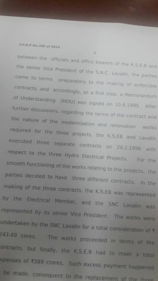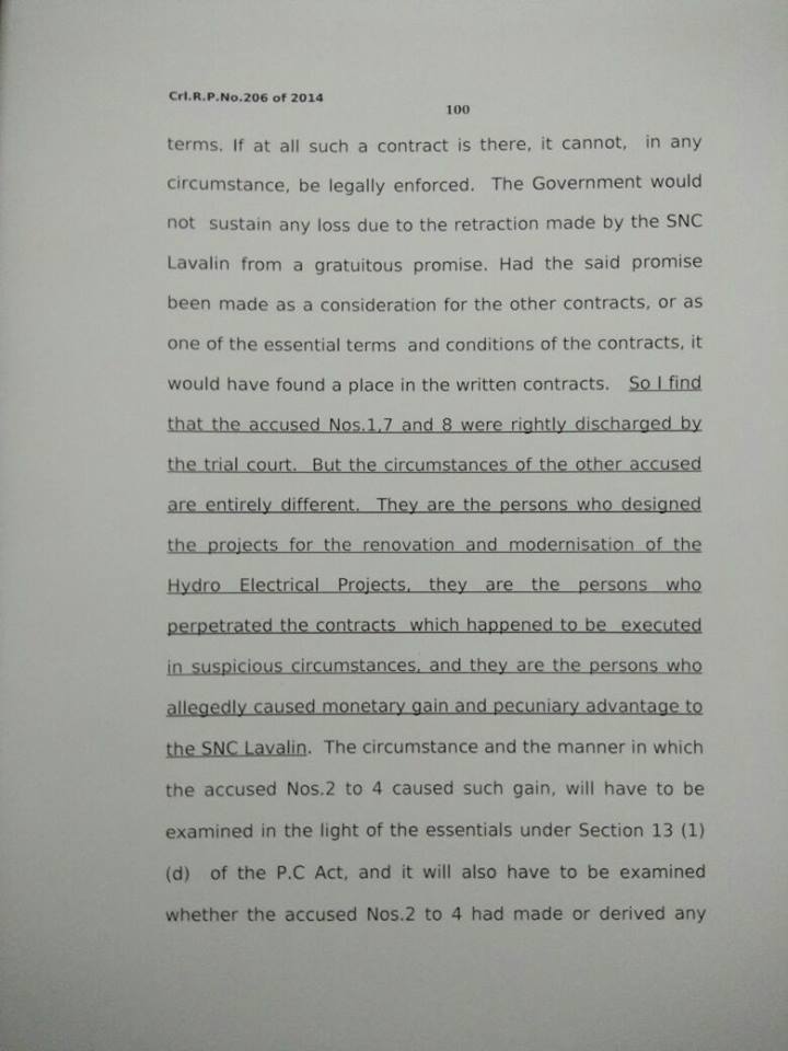 102 പേജുള്ള വിധിന്യായമാണ് വായിച്ചത്. സിബിഐ സമർപ്പിച്ച കുറ്റപത്രത്തിലെ കണ്ടെത്തലുകൾ അപൂർണമാണെന്നു വ്യക്തമാക്കിയാണ് പിണറായി വിജയനടക്കം ഏഴു പേരെ സിബിഐ പ്രത്യേക കോടതി പ്രതിപ്പട്ടികയിൽനിന്ന് നേരത്തെ ഒഴിവാക്കിയത്. തുടർന്ന് ഇതിനെതിരെറിവിഷൻ ഹർജിയുമായി സിബിഐ ഹൈക്കോടതിയെ സമീപിക്കുകയായിരുന്നു. സുപ്രീംകോടതി അഭിഭാഷകൻ ഹരീഷ് സാൽവെയാണ് കേസുമായി ബന്ധപ്പെട്ട് പിണറായി വിജയനായി ഹൈക്കോടതിയിൽ ഹാജരായത്. പള്ളിവാസൽ, ചെങ്കുളം, പന്നിയാർ ജലവൈദ്യുത പദ്ധതികളുടെ പുനരുദ്ധാരണത്തിന്, കനേഡിയൻ കമ്പനിയായ എസ്എൻസി ലാവ്ലിനുമായി ഒപ്പിട്ട കരാറുകളുമായി ബന്ധപ്പെട്ട വ്യവസ്ഥാ ലംഘനങ്ങളാണ് കേസിനു കാരണം.