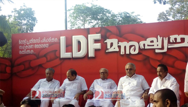 തിരുവനന്തപുരം: സമ്പദ് വ്യവസ്ഥയെയെയും സഹകരണ മേഖലയെയും അടിമുടിയുലച്ച നോട്ട് പിൻപിൻവലിക്കൽ ദുരിതത്തിനെതിരെ എൽഡിഎഫ് മനുഷ്യചങ്ങല തീർത്തു. കോടിയേരിയുടെ 'വലംകൈയായി' പിണറായിയും ഇടംകൈ പിടിച്ച് വിഎസും പങ്കാളികളായി. തിരുവനന്തപുരം മുതൽ കാസർഗോഡ് വരെ അഞ്ച് ലക്ഷത്തിലേറെ പേർ കൈകോർത്തു.