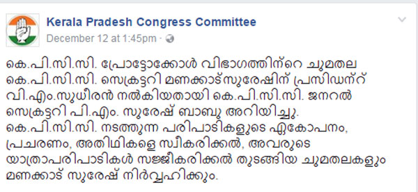 കെപിസിസി. നടത്തുന്ന പരിപാടികളുടെ ഏകോപനം, പ്രചരണം, അതിഥികളെ സ്വീകരിക്കൽ, അവരുടെ യാത്രാപരിപാടികൾ സജ്ജീകരിക്കൽ തുടങ്ങിയ ചുമതലകളാണ് പ്രോട്ടോകോൾ ഓഫീസറായി മണക്കാട് സുരേഷിന് നിർവ്വഹിക്കാനുള്ളത്. അതായത് കേന്ദ്ര നേതാക്കളുടെ സർവ്വ ചലനവും സുധീരന്റെ വിശ്വസ്തൻ നിർവ്വഹിക്കും. ഹൈക്കമാണ്ട് പ്രതിനിധികളുടെ അടുത്തേക്ക് എ-ഐ ഗ്രൂപ്പ് മാനജർമാർ എത്തുന്നത് തടയാനാണ് ഇതെന്നാണ് വിമർശനം. ഇതിന് വേണ്ടി മാത്രമാണ് ഇതുവരെയില്ലാത്ത പദവിയുണ്ടാക്കിയത്. രാഷ്ട്രീയ കാര്യ സമിതിയിൽ പോലും ചർച്ച ചെയ്യാതെ ഇത്തരത്തിലൊരു നിയമനം നടത്താനുള്ള അധികാരം കെപിസിസിക്കുണ്ടോ എന്ന് സംശയിക്കുന്നവരുമുണ്ട്. ഏതായാലും മണക്കാട് സുരേഷിന്റെ നിയമനം അടുത്ത രാഷ്ട്രീയകാര്യ സമിതിയിൽ ചർച്ചയാക്കാനാണ് ഗ്രൂപ്പ് നേതാക്കളുടെ തീരുമാനം. ആരോടും ആലോചിക്കാതെ തന്നിഷ്ടം കാട്ടാൻ സുധീരനെ അനുവദിക്കില്ലെന്നാണ് ഉയരുന്ന അഭിപ്രായം.