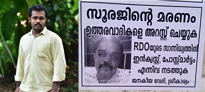 മിനാഞ്ഞാന്ന് രാവിലെ മരിച്ച സൂരജിന്റെ മൃതശരീരം ഇന്നലെ വൈകുന്നേരത്തോടെയാണ് പോസ്റ്റ് മോർട്ടം നടപടികൾക്ക് ശേഷം ബന്ധുക്കൾക്ക് വിട്ട് കൊടുത്തത്. ഇന്നലെ വൈകുന്നേരം അഞ്ച് മണിയോടെ് വീട്ടുവളപ്പിൽ സൂരജിന് അന്ത്യയാത്രയേകി നാട്ടുകാർ. മാന്യനായ ഒരു ചെറുപ്പക്കാരെന്ന് ബന്ധുക്കളും സുഹൃത്തുക്കളും ഒരുപോലെ അഭിപ്രായപ്പെടുന്ന സൂരജിന്റെ മരണം വിശ്വസിക്കാനാകാതെ നിൽക്കുകയാണ് എല്ലാവരും.