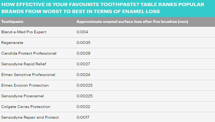പ്രധാനപ്പെട്ട ടൂത്ത് പേസ്റ്റുകളുടെ റാങ്കിങ് താഴൈ കൊടുക്കുന്നു. ഏറ്റവും മോശം പേസ്റ്റിൽ നിന്ന് ഏറ്റവും നല്ല പേസ്റ്റിലേക്കാണ് റാങ്കിങ് പട്ടിക തയ്യാറാക്കിയിരിക്കുന്നത്.