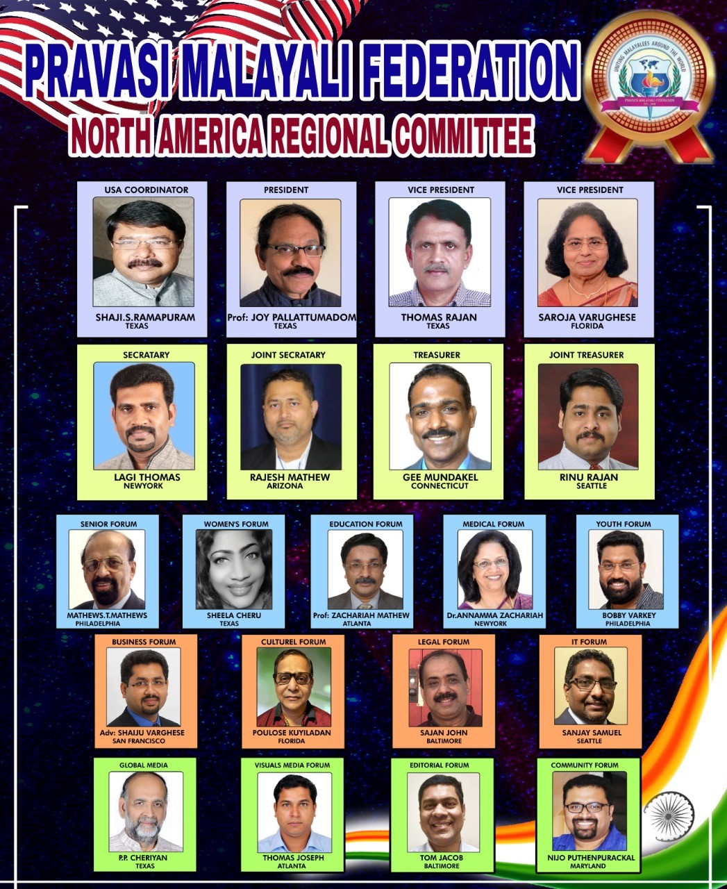 പ്രവാസി മലയാളീ ഫെഡറേഷൻ നോർത്ത് അമേരിക്ക റീജിയൺ കോർഡിനേറ്റർ ഷാജീ എസ്.രാമപുരത്തിന്റെ നേതൃത്വത്തിൽ പ്രൊഫ: ജോയ് പല്ലാട്ടുമഠം (പ്രസിഡന്റ്), തോമസ് രാജൻ (വൈസ്.പ്രസിഡന്റ്), സരോജ വർഗീസ് (വൈസ് പ്രസിഡന്റ്), ലാജി തോമസ് (സെക്രട്ടറി), രാജേഷ് മാത്യു (ജോയിന്റ് സെക്രട്ടറി), ജീ മുണ്ടക്കൽ (ട്രഷറാർ), റിനു രാജൻ, (ജോയിന്റ് ട്രഷറാർ).വിവിധ ഫോറങ്ങളുടെ അധ്യക്ഷന്മാരായ മാത്യുസ് ടി.മാത്യൂസ്, ഷീല ചെറു, പ്രൊഫ.സഖറിയ മാത്യു, ഡോ.അന്നമ്മ സഖറിയ, ബോബി വർക്കി, സൈജു വർഗീസ്, പൗലോസ് കുയിലാടൻ, സാജൻ ജോൺ, സഞ്ജയ് സാമുവേൽ, തോമസ് ജോസഫ്, ടോം ജേക്കബ്, നിജോ പുത്തൻപുരക്കൽ എന്നിവരടങ്ങുന്ന എക്സിക്യൂട്ടിവ് കമ്മറ്റിയാണ് അമേരിക്ക റീജിയൺ പ്രവർത്തനങ്ങൾക്ക് ചുക്കാൻ പിടിക്കുന്നത്.