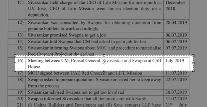 ഇതേ സമയത്താണ് ലൈഫ് മിഷൻ സിഇഒയായിരുന്ന യുവി ജോസ് തെരഞ്ഞെടുപ്പ് ഡ്യൂട്ടിക്ക് പോകുന്നതും ഒരു മാസത്തേക്ക് ചുമതല ശിവശങ്കറിന് വരുന്നതും. അന്ന് മുന്നൊരുക്കം തുടങ്ങുന്നു. 2019 ഏപ്രിലിൽ സ്വപ്ന ലൈഫ് മിഷന് വേണ്ടി ക്വട്ടേഷൻ വാങ്ങുന്നു. 2019ൽ സ്വപ്നയ്ക്ക് ജോലി ഓഫർ. പിന്നീട് മുഖ്യമന്ത്രിയുടെ നിർദ്ദേശ പ്രകാരമാണ് ജോലിയെന്ന് അറിയിക്കുന്നു. റെഡ് ക്രസന്റ് പദ്ധതിയുടെ എംഒയു വിവരങ്ങൾ കൈമാറുന്നു. 2019 ജൂലൈയിലാണ് മുഖ്യമന്ത്രിയും കോൺസുൽ ജനറലും സ്വപ്നയും ശിവശങ്കറുമായുള്ള ചർച്ച നടക്കുന്നത്. ഇതേ മാസമാണ് ധാരണാ പത്രത്തിൽ ഒപ്പിടുന്നതും.