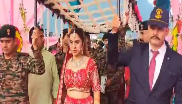 വിവാഹ മണ്ഡപത്തിലേക്ക് വധുവിനെ ആനയിക്കാന് യൂണിഫോമില് പട്ടാള ഉദ്യോഗസ്ഥര് അണിനിരന്നപ്പോള് ആ കാഴ്ച ഏവരുടേയും കണ്ണുകളെ ഈറനണിയിച്ചു. ഹിമാചല് പ്രദേശിലിലെ സിര്മൗര് ജില്ലയിലെ ഭര്ലി ഗ്രാമത്തില് ആരാധന എന്ന യുവതിയുടെ വിവാഹത്തിനാണ് ബിഎസ്എഫ് ഉദ്യോഗസ്ഥര് പങ്കെടുക്കാനെത്തിയത്. മകന്റെ സുഹൃത്തുക്കളായ പട്ടാളക്കാര് മുന്നില് നിന്നും വിവാഹം നടത്തിയപ്പോള് കുടുംബാംഗങ്ങള്ക്കും അത് വൈകാരിക മൂഹൂര്ത്തമായി.