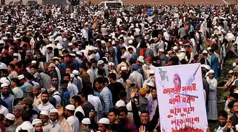 ശനിയാഴ്ച ധാക്ക സര്വകലാശാല പള്ളിക്ക് സമീപം നടന്ന ഹാദിയുടെ സംസ്കാര ചടങ്ങ് വലിയ പ്രതിഷേധ സംഗമമായി മാറി. പതിനായിരക്കണക്കിന് ആളുകള് പങ്കെടുത്ത ചടങ്ങില് മുദ്രാവാക്യങ്ങള് മുഴങ്ങിയത് മേഖലയില് വലിയ ആശങ്ക സൃഷ്ടിച്ചിട്ടുണ്ട്. ഹാദിയുടെ കൊലപാതകത്തിന് പിന്നിലുള്ളവരെ 24 മണിക്കൂറിനുള്ളില് അറസ്റ്റ് ചെയ്തില്ലെങ്കില് പ്രക്ഷോഭം കടുപ്പിക്കുമെന്ന് ഇന്ഖിലാബ് മഞ്ച് ഇടക്കാല സര്ക്കാരിന് അന്ത്യശാസനം നല്കി. ഷെയ്ഖ് ഹസീന സര്ക്കാരിന്റെ പതനത്തിന് വഴിതെളിച്ച പ്രക്ഷോഭങ്ങളില് പ്രധാന പങ്കുവഹിച്ച നേതാവായിരുന്നു ഹാദി.