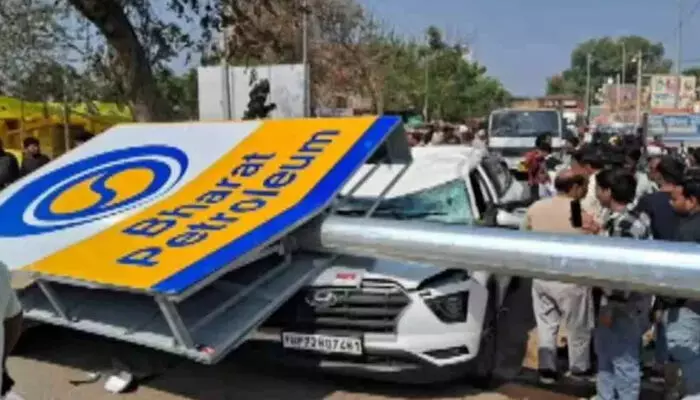 ഓടിക്കൊണ്ടിരുന്ന കാറിന് മുകളിലേക്ക് പെട്രോള് പമ്പിലെ ഹൈമാസ്റ്റ് ലൈറ്റ് പോസ്റ്റ് വീണു; സമാജ്വാദി പാര്ട്ടി നേതാവിന് ദാരുണാന്ത്യം
