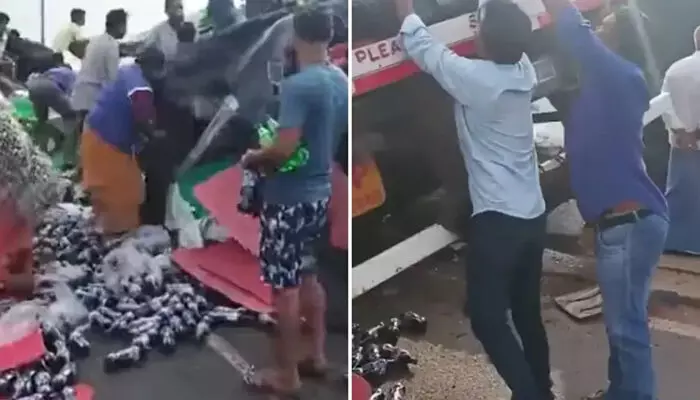 നെല്ലൂര് ജില്ലയില് ദേശീയ പാതയിലാണ് അപകടമുണ്ടായതെന്നാണ് വിവരം. റോഡരികില് മറിഞ്ഞുകിടക്കുന്ന ലോറിക്ക് ചുറ്റും ചിതറിക്കിടക്കുന്ന ശീതളപാനീയ കുപ്പികള് ശേഖരിക്കാന് ആളുകള് തിക്കിത്തിരക്കുന്നത് ദൃശ്യങ്ങളില് കാണാം. കിട്ടാവുന്നത്ര കുപ്പികള് സ്വന്തമാക്കാനായിരുന്നു അവിടെ തടിച്ചുകൂടിയവരുടെ ശ്രമം. വാഹനത്തിന് അടുത്തേക്ക് ഓടിയെത്തുന്ന ആളുകള് കുപ്പികളുമായി സ്ഥലം വിടുന്നതും ദൃശ്യങ്ങളിലുണ്ട്.