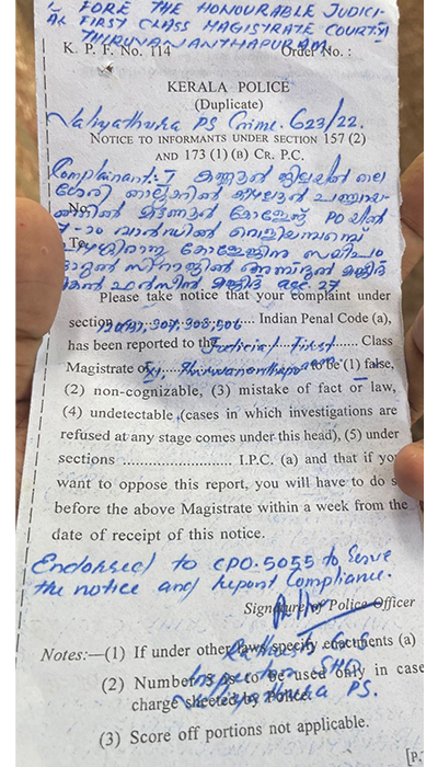 വലിയതുറ പൊലീസ് കണ്ണൂരിലെത്തിയാണ് പരാതിക്കാർക്കു നോട്ടിസ് കൈമാറിയത്. പൊലീസ് റിപ്പോർട്ടിൽ പരാതിയുണ്ടെങ്കിൽ ഒരാഴ്ചയ്ക്കുള്ളിൽ കോടതിയെ സമീപിക്കാമെന്നും നിർദ്ദേശിച്ചിട്ടുണ്ട്. യൂത്ത് കോൺഗ്രസ് നേതാക്കളുടെ പരാതി കളവാണെന്നാണ് വലിയതുറ പൊലീസ് തിരുവനന്തപുരം ജുഡീഷ്യൽ ഫസ്റ്റ് ക്ലാസ് മജിസ്ട്രേറ്റ് കോടതിയിൽ റിപ്പോർട്ട് നൽകിയിരിക്കുന്നത്. യൂത്ത് കോൺഗ്രസിന്റെ പരാതിയിൽ മുഖ്യമന്ത്രിയുടെ പഴ്സണൽ സ്റ്റാഫുകളായ അനിൽ കുമാർ, വി എം.സുനീഷ് എന്നിവർക്കെതിരെയും കേസെടുത്തിരുന്നു. പരാതി നൽകിയെങ്കിലും പൊലീസ് കേസെടുക്കാത്തതിനെ തുടർന്നാണ് യൂത്ത് കോൺഗ്രസ് നേതാക്കൾ കോടതിയെ സമീപിച്ചത്.