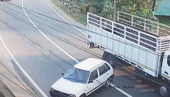 പഴയ വെള്ള മാരുതിയിൽ പാഞ്ഞെത്തി കടയുടെ മുന്നിൽ പാർക്ക് ചെയ്തു; ഉടമ ഇറങ്ങി കുറച്ച് കഴിഞ്ഞതും നെഞ്ചിടിപ്പിക്കുന്ന കാഴ്ച; ഇരച്ചെത്തിയ ലോറിയിൽ ഇടിക്കാതെ പോയത് ജസ്റ്റ് മിസ്സിന്