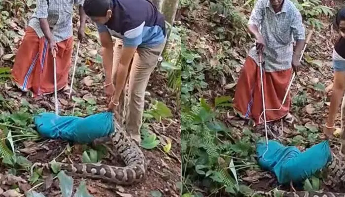 14 അടി നീളം, 100 കിലോഗ്രാമിലധികം ഭാരം; നിലമേലിൽ വീട്ടിലെ പറമ്പിൽ നിന്നും പിടികൂടിയത് കൂറ്റൻ പെരുമ്പാമ്പിനെ