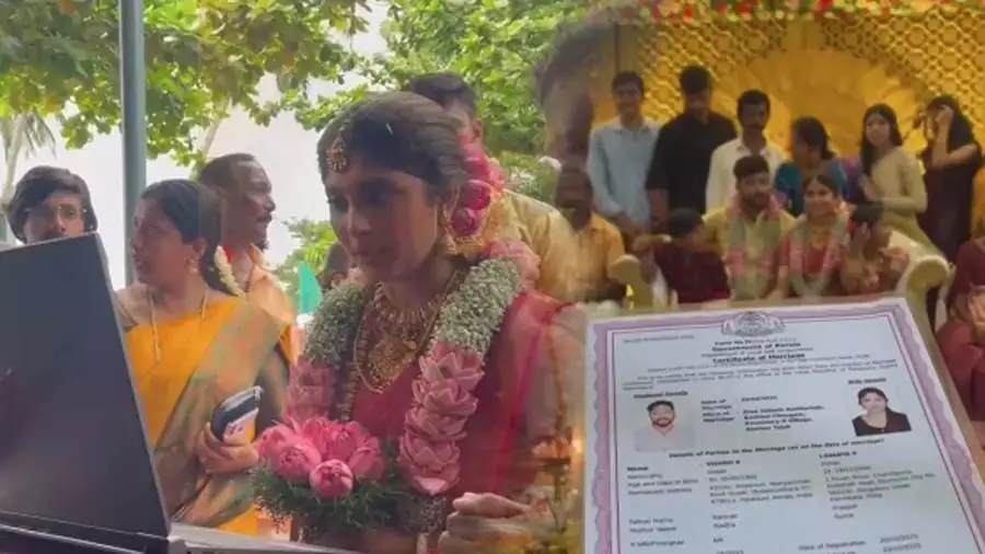 ദീപാവലി ദിവസമായ ഇന്നായിരുന്നു ലാവണ്യയുടെയും വിഷ്ണുവിന്റെയും വിവാഹം. വിവാഹം കഴിഞ്ഞയുടന് തന്നെ കെ- സ്മാര്ട്ട് വഴി ഇരുവരും വിവാഹ രജിസ്ട്രേഷന് അപേക്ഷ വീഡിയോ കെവൈസി വഴി പൂര്ത്തിയാക്കി. അവധിദിനമായിട്ട് പോലും കാവശ്ശേരി പഞ്ചായത്ത് ജീവനക്കാര് തത്സമയം ഈ അപേക്ഷ അപ്രൂവ് ചെയ്തു. മിനുട്ടുകള്ക്കകം സര്ട്ടിഫിക്കറ്റ് വാട്ട്സാപ്പിലെത്തി. വധൂവരന്മാര്ക്കൊപ്പം ഫോട്ടോയെടുക്കാന് പഞ്ചായത്ത് അംഗം ടി വേലായുധന് എത്തിയപ്പോള് നവദമ്പതികള്ക്ക് പ്രിന്റ് ചെയ്ത സര്ട്ടിഫിക്കറ്റും കൈമാറി.