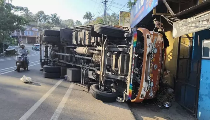ഫുൾ ലോഡുമായി എത്തിയ ലോറി; വളവിൽ ഇരച്ചെത്തിയതും നിയന്ത്രണം നഷ്ടപ്പെട്ട് അപകടം; ഡ്രൈവർക്കും കിളിക്കും പരിക്ക്; സംഭവം പാറശ്ശാലയിൽ