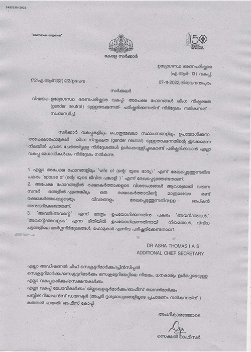 സർക്കാർ വകുപ്പുകളിലും പൊതുമേഖല സ്ഥാപനങ്ങളിലും ഉപയോഗിക്കുന്ന അപേക്ഷാഫോമുകൾ ലിംഗ നിഷ്പക്ഷതയുള്ളതാകുന്നതിന്റെ തുടക്കമെന്ന നിലയിലാണ് നിർദ്ദേശം.