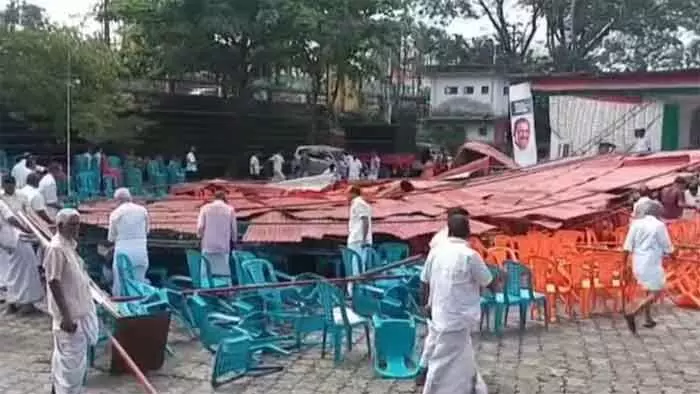 ഉദ്ഘാടനത്തിന് നിമിഷങ്ങള്ക്ക് മുന്പാണ് വേദിയുടെ ഒരുഭാ?ഗത്തേക്ക് പന്തല് ചെരിഞ്ഞ് വീണത്. മൂന്ന് പ്രവര്ത്തകര് തകര്ന്നുവീണ പന്തലിനടിയില് കുടുങ്ങിയിരുന്നു. നിസാരപരിക്കേറ്റ അവരെ പുറത്തെടുത്തു. മറ്റ് ആളപായങ്ങളില്ല.
