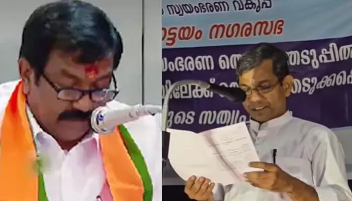 കോട്ടയത്തും തിരുവനന്തപുരത്തും സംസ്കൃതത്തില് സത്യപ്രതിജ്ഞ ചെയ്ത് ബിജെപി കൗണ്സിലര്മാര്; ഗണഗീതം പാടി പ്രവര്ത്തകര്