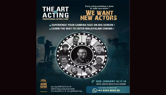 കൊച്ചി : ആക്ടേഴ്സ് ഫാക്ടറി യുടെ മൂന്നാമത് ആക്ടിംഗ് വര്ക്ക്ഷോപ്പ് ജനുവരി 16 17 18 കൊച്ചിയില് HOTEL ARCTIC GOLD, വൈറ്റില യില് വെച്ച് നടക്കുന്നു. സൂപ്പര്ഹിറ്റ് സംവിധായകന് ലാല് ജോസ് അടക്കം ഒട്ടേറെ സിനിമ പ്രവര്ത്തകരാണ് ഈ അഭിനയ പരിശീലന കളരിക്ക് നേതൃത്വം നല്കുന്നത്.