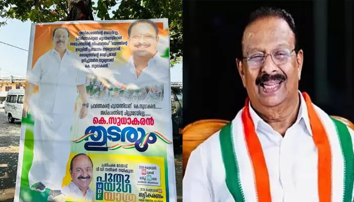 'അധികാരത്തിന്റെ തണലിലല്ല. പ്രവര്ത്തകരുടെ ഹൃദയങ്ങളിലാണ് അദ്ദേഹത്തിന്റെ സിംഹാസനം. ഭയത്തിന്റെ ഇരുളില് പ്രസ്ഥാനം തളരുമ്പോള് ധൈര്യത്തിന്റെ വെളിച്ചമായി ഉദിച്ചുയര്ന്ന സൂര്യനാണ് കെ സുധാകരന്. പ്രവര്ത്തകന്റെ ഹൃദയത്തിലാണ് അദ്ദേഹം, അധികാരത്തിന്റെ ചില്ലുമേടയിലല്ല. കെ സുധാകരന് തുടരും' എന്നാണ് ഫ്ളക്സിലെ വാക്കുകള്. അധികാരവും ചെങ്കോലും ഇല്ലെങ്കിലും പ്രവര്ത്തകര്ക്ക് വേണ്ടി പടച്ചട്ട അണിഞ്ഞവനാണ് സുധാകരനെന്നും വിശേഷണമുണ്ട്. കഴിഞ്ഞ ദിവസം കാസര്ഗോഡ് നിന്ന് തുടങ്ങിയ പൊതുയോഗയാത്രയില് നിന്ന് സുധാകരന് ഇറങ്ങിപ്പോയതിന് തൊട്ട് പിന്നാലെയാണ് ഫ്ലക്സ് ബോര്ഡുകള് പ്രത്യക്ഷപ്പെട്ടത്.