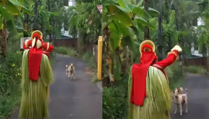തെയ്യക്കോലത്തിന് നേരെ കുരച്ചുചാടി തെരുവുനായ്ക്കള്; ചിലമ്പൊലിയും അട്ടഹാസവുമായി വിരട്ടിയോടിച്ച് തെയ്യക്കോലം