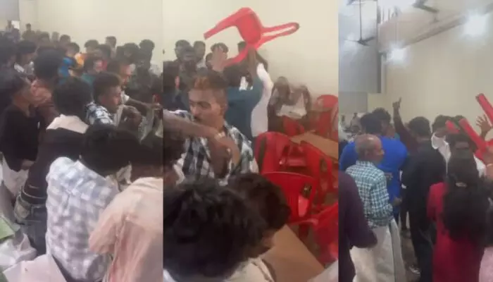 മാറനല്ലൂര് നരുവാമൂട് പൊലീസ് സ്റ്റേഷനുകളുടെ അതിര്ത്തി പ്രദേശത്താണ് സംഭവം. വിവരമറിഞ്ഞ് മാറനല്ലൂരില് നിന്നും നരുവമൂട്ടില് നിന്നും പൊലീസ് കല്യാണ മണ്ഡപത്തിലെത്തി. അതേസമയം സംഭവത്തില് ഇരു കൂട്ടരും പരാതി നല്കാന് തയ്യാറായില്ല. ഇതോടെ പൊലീസ് സംഘം മടങ്ങി. ഇന്ന് രാവിലെ മുതല് അടിയുടെ ദൃശ്യങ്ങള് സാമൂഹ്യ മാധ്യമങ്ങളിലൂടെ പ്രചരിച്ചു തുടങ്ങി.