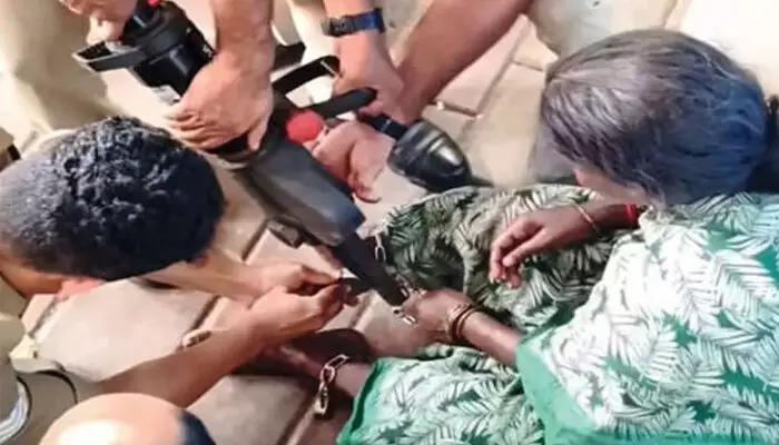 തമിഴ്നാട് നാമക്കല് സ്വദേശിനിയായ 55-കാരിയെ ആണ് ഭര്ത്താവ് ചങ്ങലയ്ക്കിട്ടത്. ശനിയാഴ്ച ഉച്ചയ്ക്ക് ഒന്നരയോടെ കൊല്ലങ്കോട് പട്ടണത്തിനടുത്താണ് കാലുകള് ചങ്ങലയ്ക്കിട്ട നിലയില് സ്ത്രീയെ കണ്ടെത്തുന്നത്. തുടര്ന്ന് നാട്ടുകാര് കൊല്ലങ്കോട് അഗ്നിരക്ഷാസേനാംഗങ്ങള് ഏറെനേരം ശ്രമിച്ച് ചങ്ങലയും പൂട്ടുകളും കട്ടര് ഉപയോഗിച്ച് മുറിച്ചുമാറ്റി സ്ത്രീയെ മോചിപ്പിച്ചു. തുടര്ന്ന്, ഇവരെ കൊല്ലങ്കോട് പോലീസിന് കൈമാറി.
