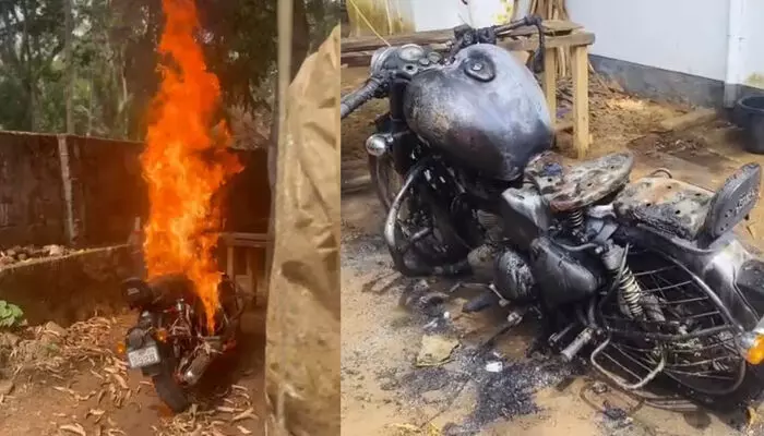 സ്റ്റാർട്ട് ചെയ്യുന്നതിനിടെ റോയൽ എൻഫീൽഡ് ബൈക്കിന് തീപിടിച്ചു; ഉടമ രക്ഷപ്പെട്ടത് അത്ഭുതകരമായി; പവർ പ്ലഗിൽ നിന്നുള്ള തകരാറെന്ന് സംശയം; സംഭവം തിരുവനന്തപുരത്ത്