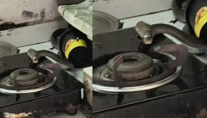 രാവിലെ അടുക്കളയിൽ ഭയപ്പെടുത്തുന്ന കാഴ്ച; ഗ്യാസ് സ്റ്റൗവിന് മുകളിൽ 'വാ' തുറന്നുപിടിച്ചിരിക്കുന്ന രീതിയിൽ കൂറ്റൻ അതിഥി; കടി കിട്ടാതെ വീട്ടുകാർ രക്ഷപ്പെട്ടത് ഭാഗ്യം കൊണ്ട്