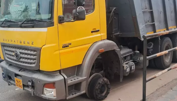 'ടാർ' കയറ്റിവന്ന ഭാരത് ബെൻസിന്റെ ടിപ്പർ ലോറി; ഓടിക്കൊണ്ടിരിക്കെ പെട്ടെന്ന് കാതടിപ്പിക്കുന്ന ശബ്ദം; മുന്നിലെ ടയർ ഊരിത്തെറിച്ച് വൻ അപകടം; സമീപത്തെ കടകൾക്ക് വൻ നാശനഷ്ടം