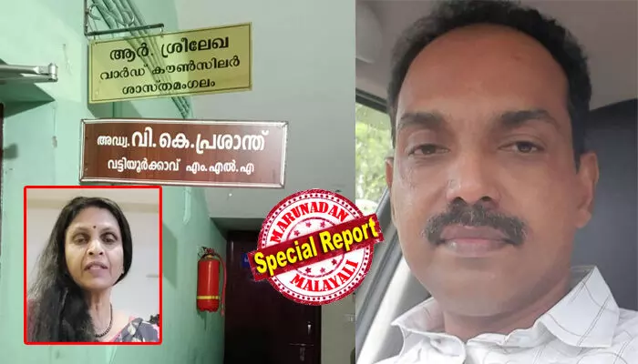 അതേസമയം, ശാസ്തമംഗലത്തെ ഓഫീസില് എംഎല്എ വി.കെ. പ്രശാന്തിന്റെ നെയിംബോര്ഡിന് തൊട്ട് മുകളില് സ്വന്തം നെയിംബോര്ഡ് സ്ഥാപിച്ച് കൗണ്സിലര് ആര്. ശ്രീലേഖ. ഓഫീസിന്റെ ഉടമസ്ഥാവകാശത്തെച്ചൊല്ലി പ്രശാന്തുമായി നിലനില്ക്കുന്ന തര്ക്കങ്ങള്ക്കിടെയാണ് ഈ നടപടി. ബോര്ഡ് സ്ഥാപിക്കുന്നതിന്റെ ചിത്രങ്ങള് ശ്രീലേഖ തന്നെയാണ് തന്റെ ഫേസ്ബുക്ക് പേജിലൂടെ പങ്കുവെച്ചത്.
