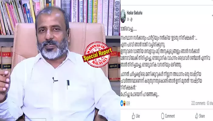 ഇന്നുവരെ വാങ്ങിയ ശമ്പളവും മറ്റ് അനുകൂല്യങ്ങളും ഞാന് സര്ക്കാര് ഖജനാവിലേക്ക് തിരിച്ചടച്ചു, ഔദ്യോഗിക വാഹനം ഡ്രൈവര് ഗണ്മാന് എന്നിവ ഞാന് തിരിച്ചയച്ചു, ഔദ്യോഗിക വസതിയും ഒഴിഞ്ഞു.