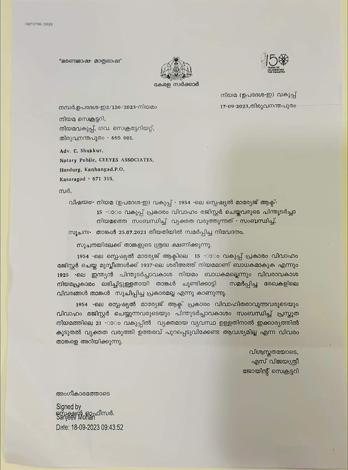 1954 ലെ സ്പഷ്യൽ മാര്യേജ് ആക്ട് പ്രകാരം വിവാഹിതരാകുന്നവരുടെയും വിവാഹം രജിസ്റ്റർ ചെയ്യുന്നവരുടെയും പിന്തുടർച്ചാവകാശം സംബന്ധിച്ചു പ്രസ്തുത നിയമത്തിലെ 21-ാം വകുപ്പിൽ വ്യക്തമായ വ്യവസ്ഥ ഉള്ളതിനാൽ ഇക്കാര്യത്തിൽ കൂടുതൽ വ്യക്തത വരുത്തി ഉത്തരവ് പുറപ്പെടുവിക്കേണ്ട ആവശ്യമില്ല എന്നാണ് നിയമ സെക്രട്ടറി വ്യക്തമാക്കിയത്.