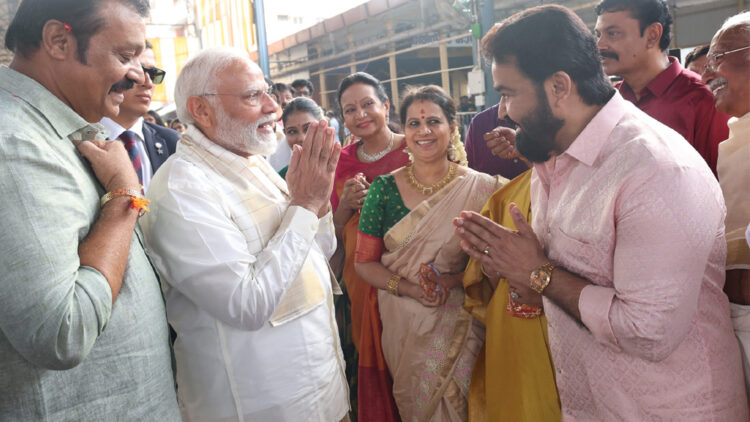 മോഹൻലാലിനെ കണ്ടതും മോദി കുശലാന്വേഷണത്തിലായി. എല്ലാവർക്കും നൽകിയത് പോലെ അക്ഷതം നൽകി. തൊട്ടടുത്ത് മമ്മൂട്ടി. മമ്മൂട്ടിയേയും മോദിക്ക് നന്നായി അറിയാം. അങ്ങനെ മലയാളത്തിലെ രണ്ട് സൂപ്പർ താരങ്ങളുമായും കുശലാന്വേഷണം മോദി നടത്തി. തൊട്ടടുത്ത് ഖുശ്ബുവും. മോദിയെ കാണാൻ നിന്ന എല്ലാ വിവിഐപി സിനിമാക്കാർക്കും മോദി അക്ഷതം നൽകി. കേരളത്തിൽ ഒരു സുരക്ഷയും കൂടാതെ എവിടേയും കടന്നു ചെല്ലാൻ കഴിയുന്നവരാണ് മോഹൻലാലും മമ്മൂട്ടിയും. രണ്ടു പേരേയും ആരും ഒരിടത്തും തടയാറില്ല. എന്നാൽ ഗുരുവായൂരിൽ ആദ്യമായി മോഹൻലാലിനും മമ്മൂട്ടിക്കും സുരക്ഷാ പരിശോധനയ്ക്ക് വിധേയരാകേണ്ടി വന്നു.
