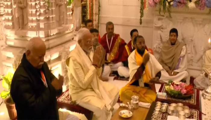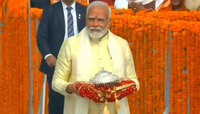 സ്വർണനിറമുള്ള കുർത്തയും ക്രീം കളറിലുള്ള ധോത്തിയും പട്കയും ധരിച്ച് ചുവന്ന ദുപ്പട്ടയിൽ വെള്ളി കുടയും ഏന്തിയാണ് പ്രധാനമന്ത്രി ശ്രീകോവിലേക്ക് എത്തിയത്. അതിന് ശേഷം ചടങ്ങിന് വേണ്ടിയുള്ള സങ്കൽപ് സ്വീകരിച്ചു.