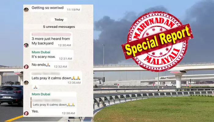 ദുബായിലെ തന്ത്രപ്രധാന കേന്ദ്രങ്ങളിൽ ഡ്രോൺ–മിസൈൽ ആക്രമണങ്ങൾ ഉണ്ടായതിന് പിന്നാലെ പ്രകാശ് പങ്കുവെച്ച വാട്സ്ആപ്പ് സ്ക്രീൻഷോട്ടുകൾ പ്രവാസലോകത്തെ നിലവിലെ ഭീതിയുടെ നേർച്ചിത്രമാവുകയാണ്. "ഇപ്പോൾ ശരിക്കും പേടി തോന്നുന്നു, ഇതിനൊരു അവസാനമില്ലേ?" എന്നായിരുന്നു ദുബായിലുള്ള അദ്ദേഹത്തിന്റെ അമ്മ അയച്ച സന്ദേശം. സുരക്ഷിത താവളമെന്ന് പേരുകേട്ട ദുബായിൽ പോലും യുദ്ധത്തിന്റെ നിഴൽ വീണത് പ്രവാസികളെ അത്രമേൽ ആശങ്കയിലാക്കിയിരിക്കുന്നു.