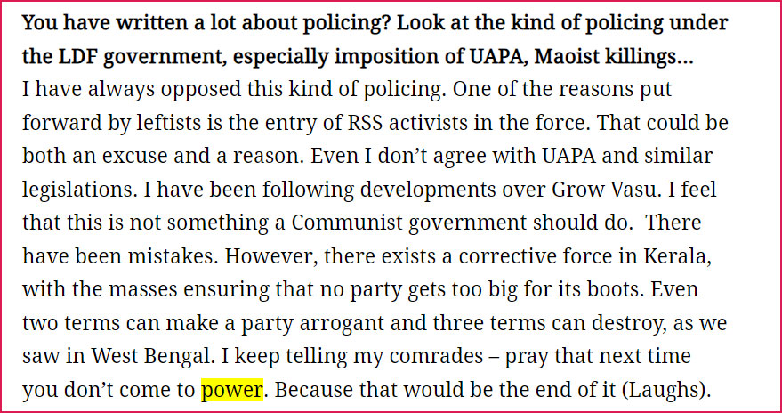 ഇത് ഒരു കമ്മ്യൂണിസ്റ്റ് സർക്കാർ ചെയ്യേണ്ട ഒന്നല്ല. തെറ്റുകൾ സംഭവിച്ചിട്ടുണ്ട്. എന്നിരുന്നാലും, കേരളത്തിൽ ഒരു തിരുത്തൽ ശക്തിയുണ്ട്. പശ്ചിമ ബംഗാളിൽ നമ്മൾ കണ്ടതുപോലെ രണ്ട് ടേം പോലും ഒരു പാർട്ടിയെ അഹങ്കാരിയാക്കുകയും മൂന്ന് ടേം നശിപ്പിക്കുകയും ചെയ്യും. മാവോയിസം എല്ലായിടത്തും പരാജയപ്പെട്ടു, ക്യൂബ അവസാനമായിരുന്നു. പാർലമെന്ററി ജനാധിപത്യമാണ് ഏറ്റവും നല്ല ഭരണസംവിധാനമെന്ന കെ. വേണുവിന്റ അഭിപ്രായത്തോട് ഞാൻ യോജിക്കുന്നു. അത്തരമൊരു പാർലമെന്റ് എല്ലാ വിഭാഗങ്ങളെയും ജാതികളെയും സ്ത്രീകളെയും ന്യൂനപക്ഷങ്ങളെയും പ്രതിനിധീകരിക്കുന്നുണ്ടോ എന്നതാണ് ചോദിക്കേണ്ട ചോദ്യമെന്നും സച്ചിദാനന്ദൻ പറഞ്ഞു.