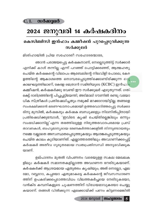 എല്ലാത്തരത്തിലും അവഗണിക്കപ്പെട്ട് കർഷകർ അതീവ ഗുരുതരമായ സ്വത്വ പ്രതിസന്ധി അനുഭവിക്കുകയാണ്. ഉൽപാദനം മുതൽ വിപണം വരെയുള്ള സകല മേഖലകളിലും കർഷകർ സമാനതകളില്ലാത്ത അവഗണനയാണ് നേരിടുന്നത്. കർഷകർക്ക് ആശ്രയമായ ഏതുതരം കൃഷിയും അത് നെല്ലോ, ഏലമോ, റബ്ബറോ കപ്പയോ ഏതുമാകട്ടെ കർഷകന്റെ ജീവസന്ധാരണത്തിന് ഉപകരിക്കപ്പെടാത്തവിധം വിലത്തകർച്ചയെ നേരിടുകയോ വൻകിട കമ്പനികളുടെ ചൂഷണത്തിന് വിധേയരാകുകയോ ചെയ്യുകയാണെന്നും സർക്കുലറിൽ പറയുന്നു.