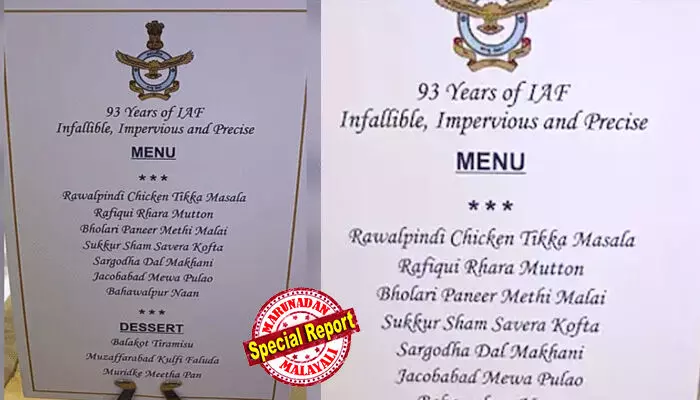 റാവല്പിണ്ടി ചിക്കന് ടിക്ക മുതല് ബഹാവല്പൂര് നാനും ബാലാകോട്ട് തിരമിസുവും വരെ: ഓപ്പറേഷന് സിന്ദൂറില് ഇന്ത്യ തിരിച്ചടിച്ച സ്ഥലപ്പേരുകള് ചേര്ത്ത് വ്യോമസേനയുടെ അത്താഴവിരുന്നിലെ മെനു; പാക്കിസ്ഥാനെ ട്രോളിയ മെനുവിന്റെ ചിത്രം സാമൂഹ്യ മാധ്യമങ്ങളില് വൈറല്