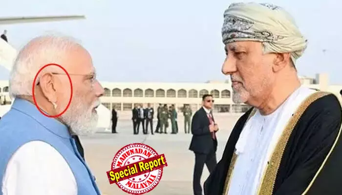 കഴിഞ്ഞദിവസം ഒമാനില് ഔദ്യോഗിക സന്ദര്ശനത്തിനെത്തിയപ്പോഴുള്ള മോദിയുടെ ലുക്കാണ് സോഷ്യല് മീഡിയയില് സജീവ ചര്ച്ചയായത്. ഒമാനിലെത്തിയ പ്രധാനമന്ത്രിക്ക് ഗംഭീര സ്വീകരണമാണ് ലഭിച്ചത്. ഒമാന് ഉപപ്രധാനമന്ത്രി സയ്യിദ് ഷിഹാബ് ബിന് താരിഖ് അല് സെയ്ദാണ് മോദിയെ സ്വീകരിക്കാന് എത്തിയത്. ഗാര്ഡ് ഒഫ് ഓണറും പരമ്പരാഗത നൃത്തവുമായി വന് സ്വീകരണമായിരുന്നു ഒരുക്കിയത്. ഈ സമയത്താണ് മോദിയുടെ ഇടതുചെവിയിലെ 'കമ്മല്' വ്യക്തമായത്.