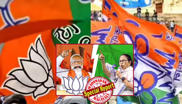 മറുഭാഗത്ത്, 'ഹൃദയമില്ലാത്ത സര്ക്കാര്' എന്ന് മമത സര്ക്കാരിനെ വിശേഷിപ്പിച്ച പ്രധാനമന്ത്രി നരേന്ദ്ര മോദി തന്നെയാണ് ബിജെപിയുടെ പ്രധാന മുഖം. സുവേന്ദു അധികാരിയെപ്പോലുള്ള പ്രാദേശിക നേതാക്കളുണ്ടെങ്കിലും മോദി പ്രഭാവത്തിലാണ് ബിജെപി പ്രതീക്ഷ വെക്കുന്നത്. ബിജെപി അധികാരത്തില് വന്നാല് 45 ദിവസത്തിനുള്ളില് ഏഴാം ശമ്പള കമ്മീഷന് നടപ്പിലാക്കുമെന്ന അമിത് ഷായുടെ വാഗ്ദാനം സര്ക്കാര് ജീവനക്കാരെ സ്വാധീനിക്കാന് ലക്ഷ്യമിട്ടുള്ളതാണ്. ബംഗാളി സ്വത്വം ഉയര്ത്തിക്കാട്ടാന് ബിജെപി 'ജയ് ശ്രീറാമി'ന് പകരം 'ജയ് മാ കാളി' മുദ്രാവാക്യം പരീക്ഷിക്കുന്നതും ശ്രദ്ധേയമാണ്.