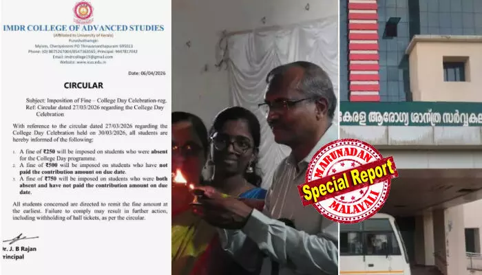 ഐ എം ഡി ആര് കോളേജ് പ്രിന്സിപ്പല് ഡോ. ജെ ബി രാജന് പുറത്തിറക്കിയ സര്ക്കുലര് വലിയ വിവാദമായി മാറിയിരുന്നു. കോളേജ് ഡേ പരിപാടിയില് പങ്കെടുക്കാതിരുന്നാല് 250 രൂപ ഫൈന് നല്കേണ്ടിവരും. കോളേജ് ഡേ പരിപാടിക്ക് സംഭാവന നല്കാതിരുന്നാല് 500 രൂപ ഫൈന് ചുമത്തുമെന്നാണ് ഭീഷണി. രണ്ടും ചെയ്യാത്തവര്ക്ക് 750 രൂപ പിഴ നല്കേണ്ടി വരുമെന്നും പ്രിന്സിപ്പലിന്റെ ഭീഷണിയുണ്ട്. പിഴ അടിച്ചില്ലെങ്കില് പരീക്ഷ എഴുതാനുള്ള ഹാള് ടിക്കറ്റ് ലഭിക്കില്ലെന്നും പ്രിന്സിപ്പലിന്റെ സര്ക്കുലറിലുണ്ട്. സര്വകലാശാല നേരിട്ട് ഇടപെട്ട് സര്ക്കുലര് പിന്വലിക്കാന് നിര്ദ്ദേശം നല്കിയതിനൊപ്പം, പ്രിന്സിപ്പലിനെതിരെ എന്താകും നടപടിയുണ്ടാകുക എന്നത് കണ്ടറിയണം.